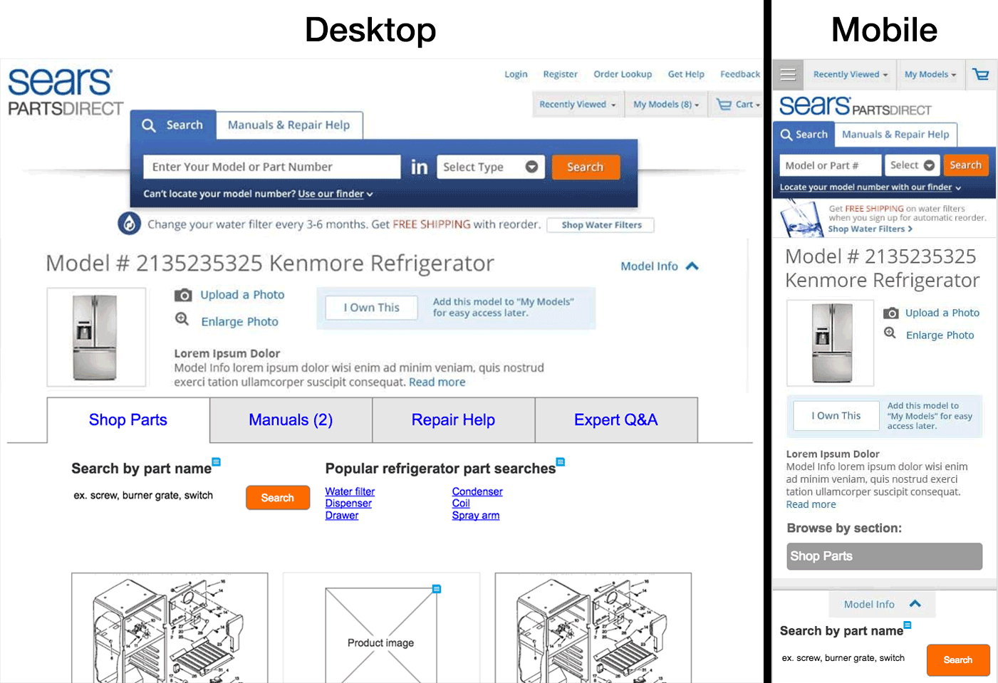 Some wire frames showing the desktop and mobile views of one page from Sears PartsDirect