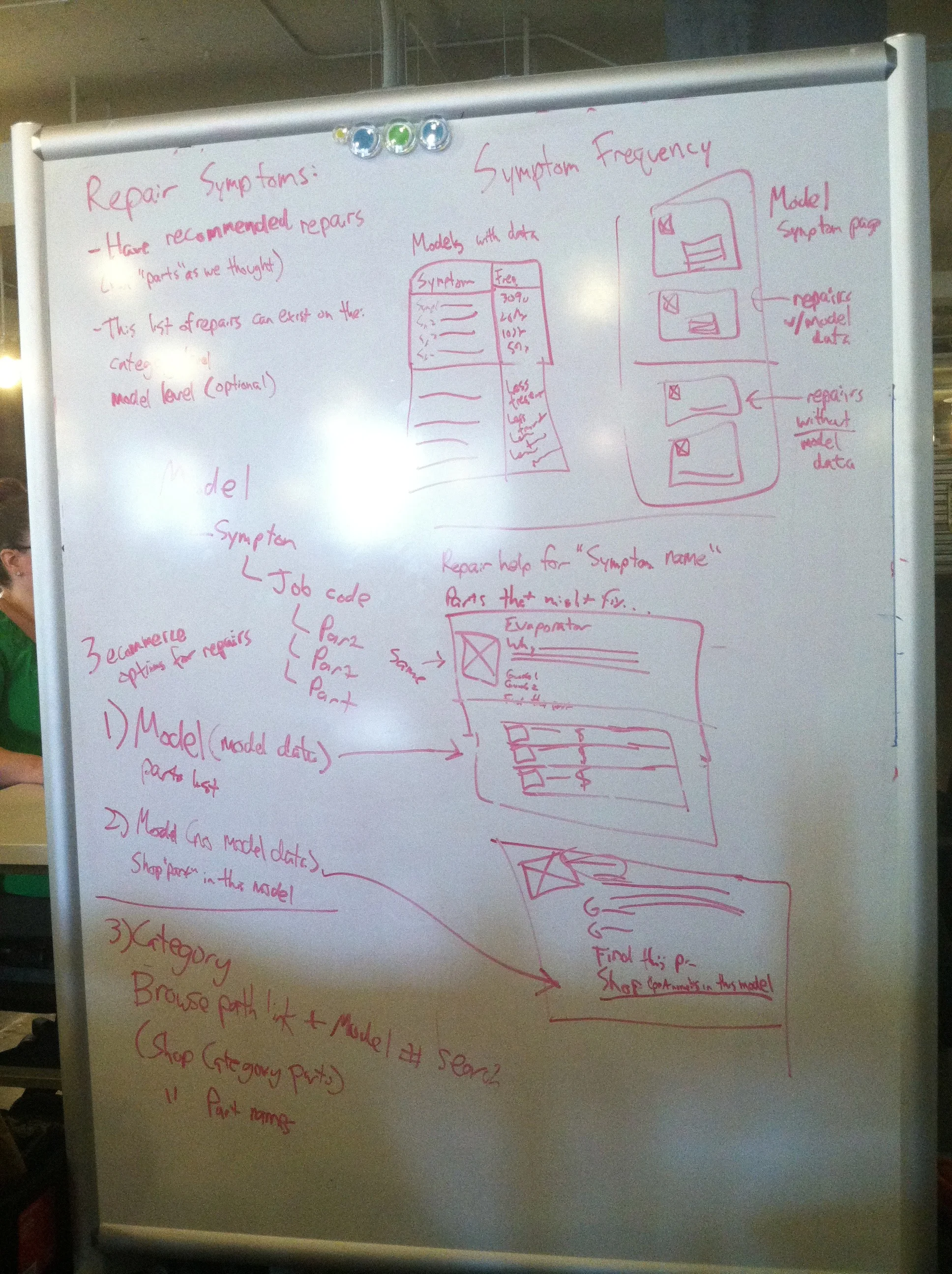 I white boarded ideas with a small design team. We'd all been working on Sears PartsDirect for about a year at that point, so we were all intimately familiar with the website's search-based purchase flow. But, we wanted to make sure we'd had a chance to discuss the way page elements should behave before we started wire framing. We did this a couple times a week throughout the project.