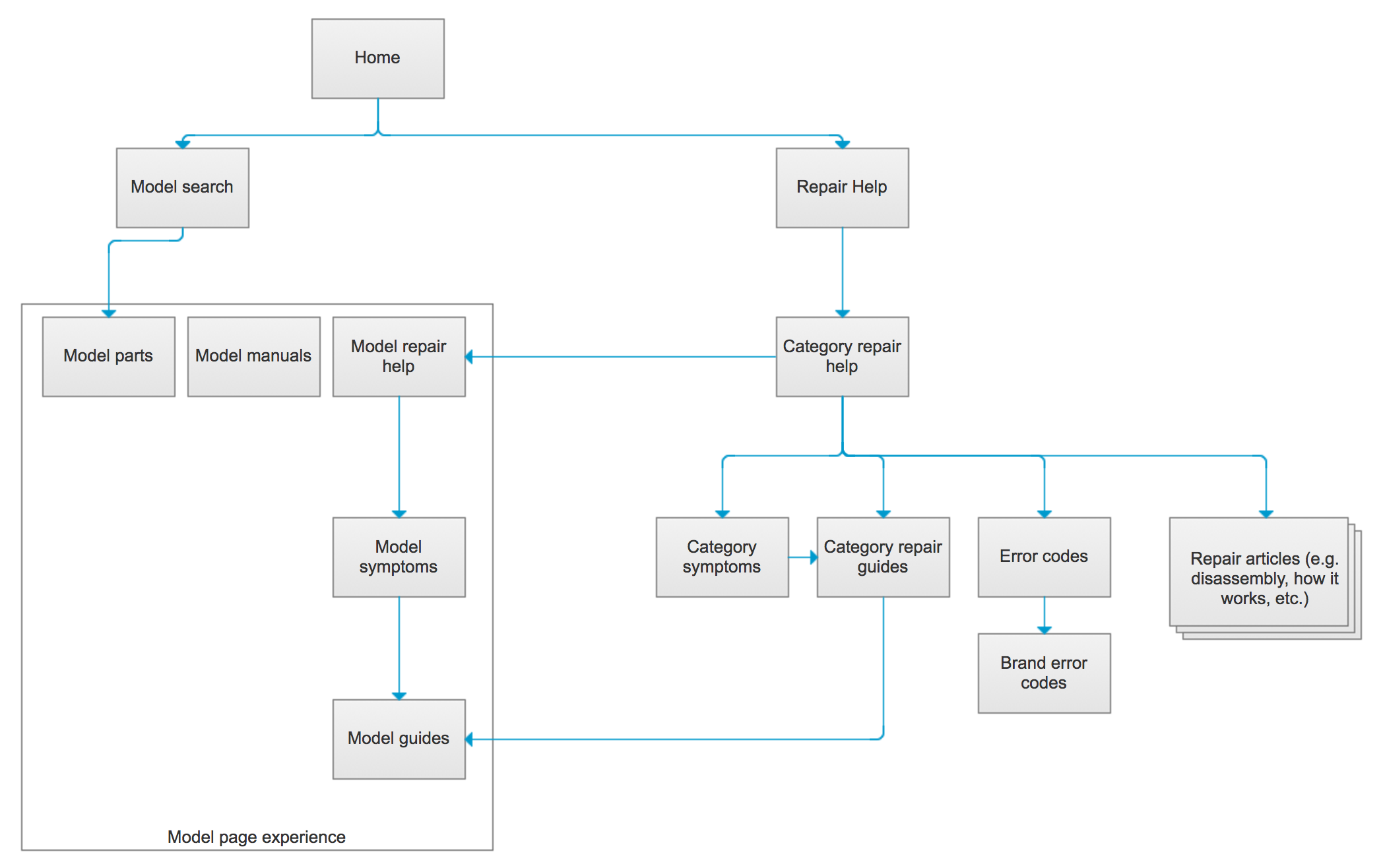The informational section of Sears PartsDirect directed users into the shopping section of the website, and users in the shopping section could access repair guides without losing their place in the shopping process.